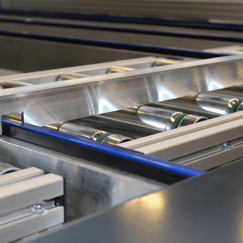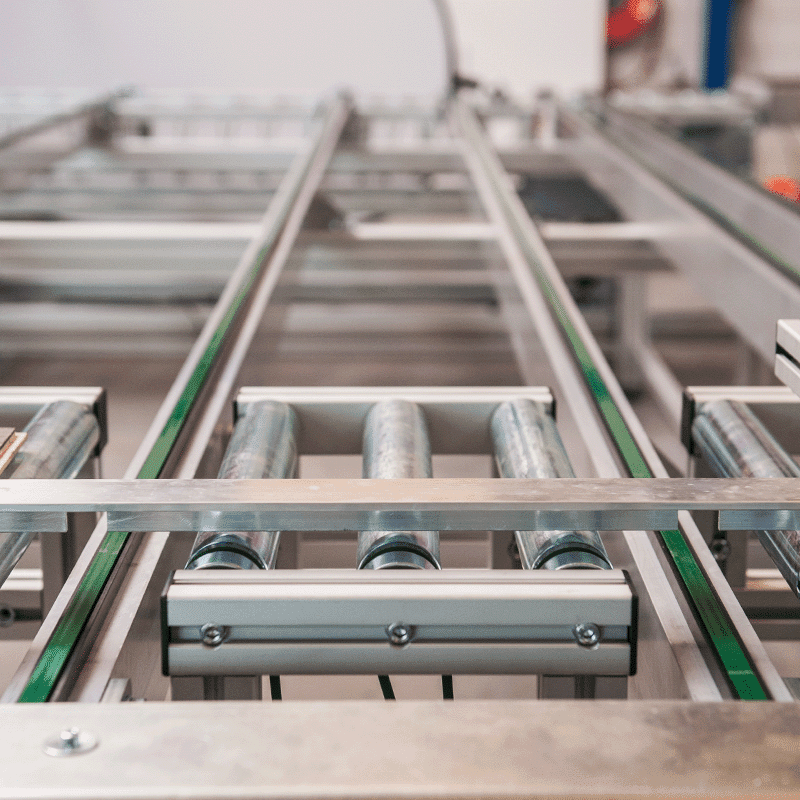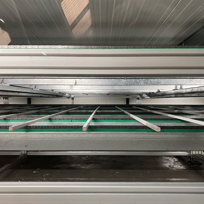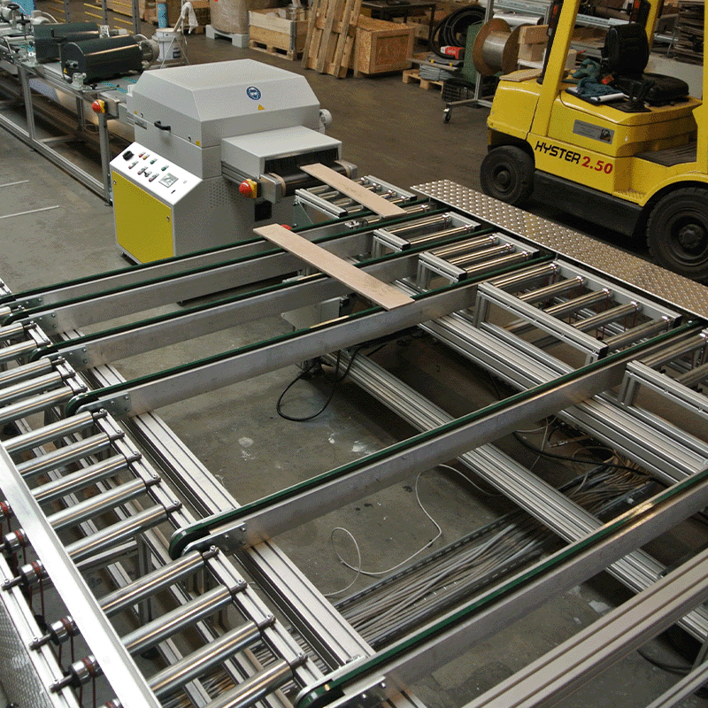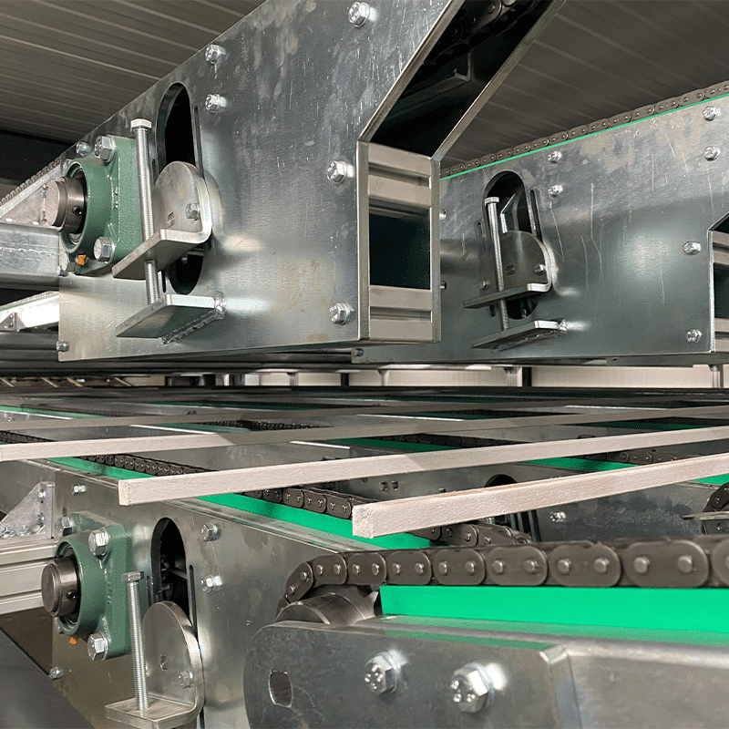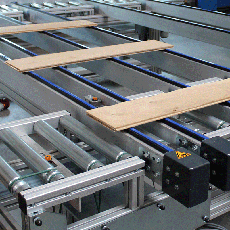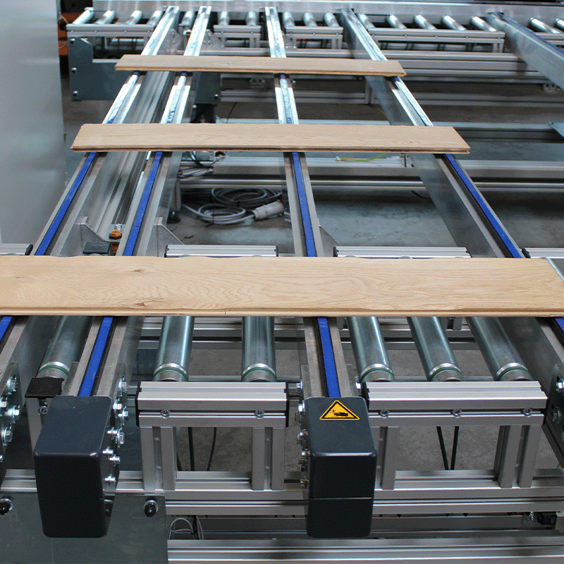 The Trivec Cross Conveyor is designed to efficiently move workpieces, such as parquet floorboards, laths, and façade wood, from one production line to the next. Ideal for spaces with limited room, it connects different production steps smoothly.